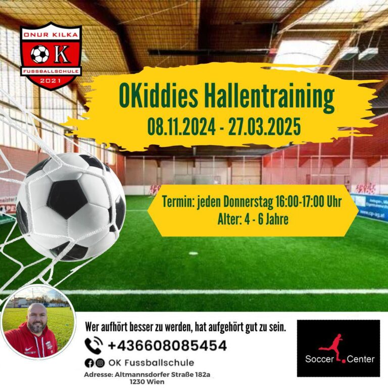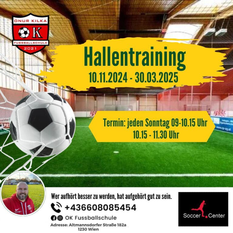 Unsere Trainingszeiten Unsere Trainings finden wie folgt statt: März - Oktober OUTDOOR ---) Naturrasen Freitag 16:30 - 19:00 UhrSonntag 10:00 - 13:00 Uhr Kindbergstrasse 14 2331 Vösendorf November - März INDOOR ---) Kunstrasen Freitag 16:30 - 17:30 UhrSonntag 09:00 - 11:30 Uhr Soccercenter Altmannsdorfer Strasse 182a 1230 Wien Unsere Trainer Onur KilkaTrainer Gökhan SariTrainer Murat BaranTrainer